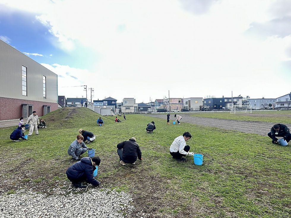 例年雪解け後の芝生の上には、除雪の際に運ばれたたくさんの石が顔を出します。